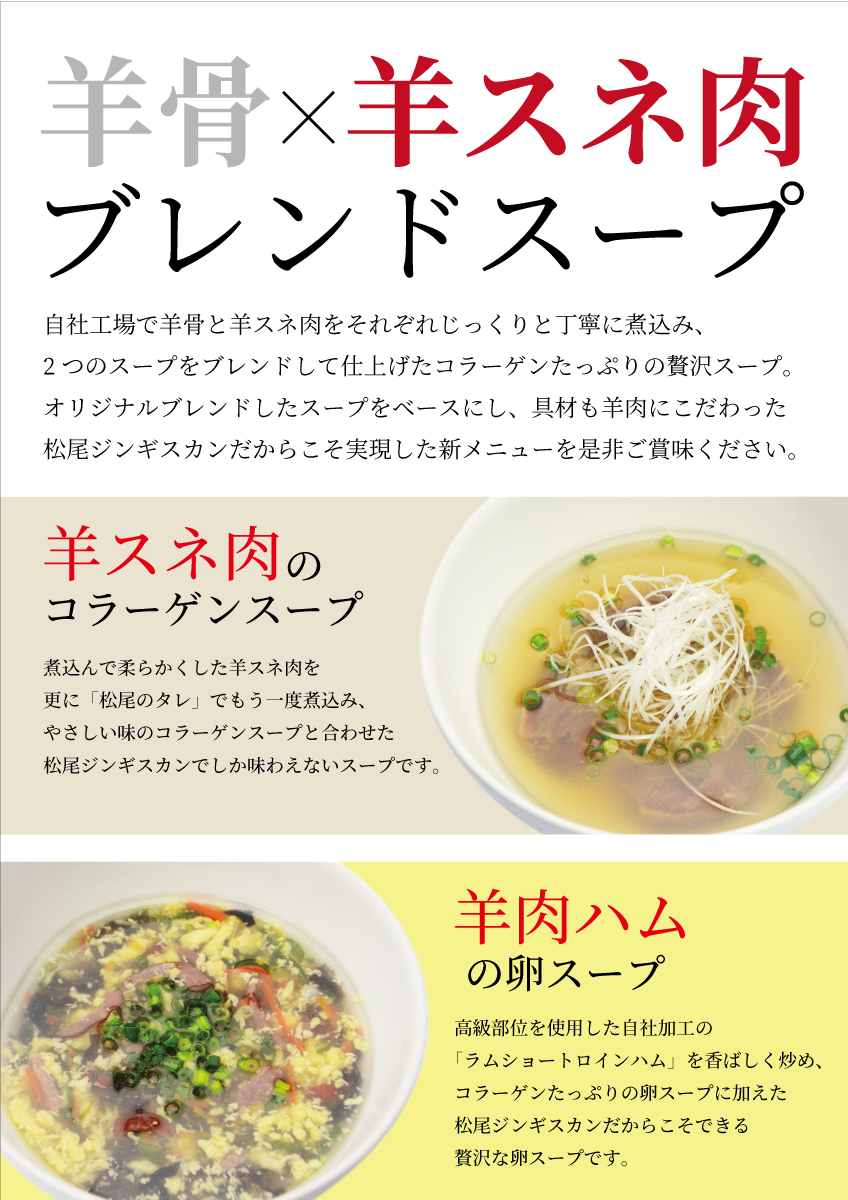オリジナルブレンドしたスープをベースにし、具材も羊肉にこだわった松尾ジンギスカンだからこそ実現した新メニューを是非ご賞味ください。