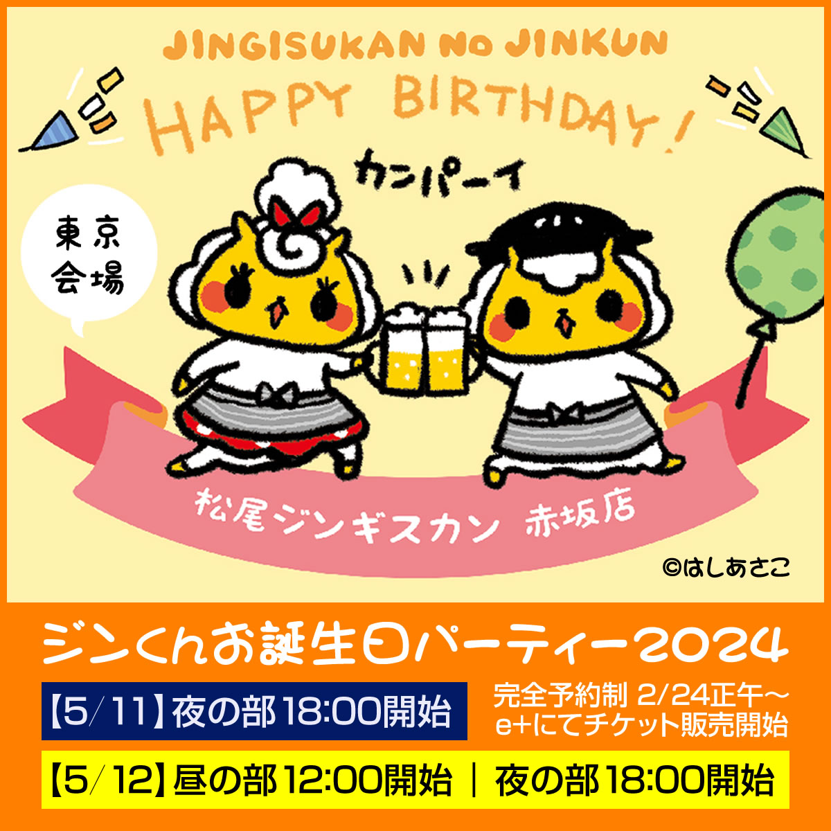 松尾ジンギスカン赤坂店にて、ジンくんお誕生日パーティー2024を開催いたします。5月11日の夜、5月12日の昼夜の合計3回公演で、今回はカンくんも登場いたします。