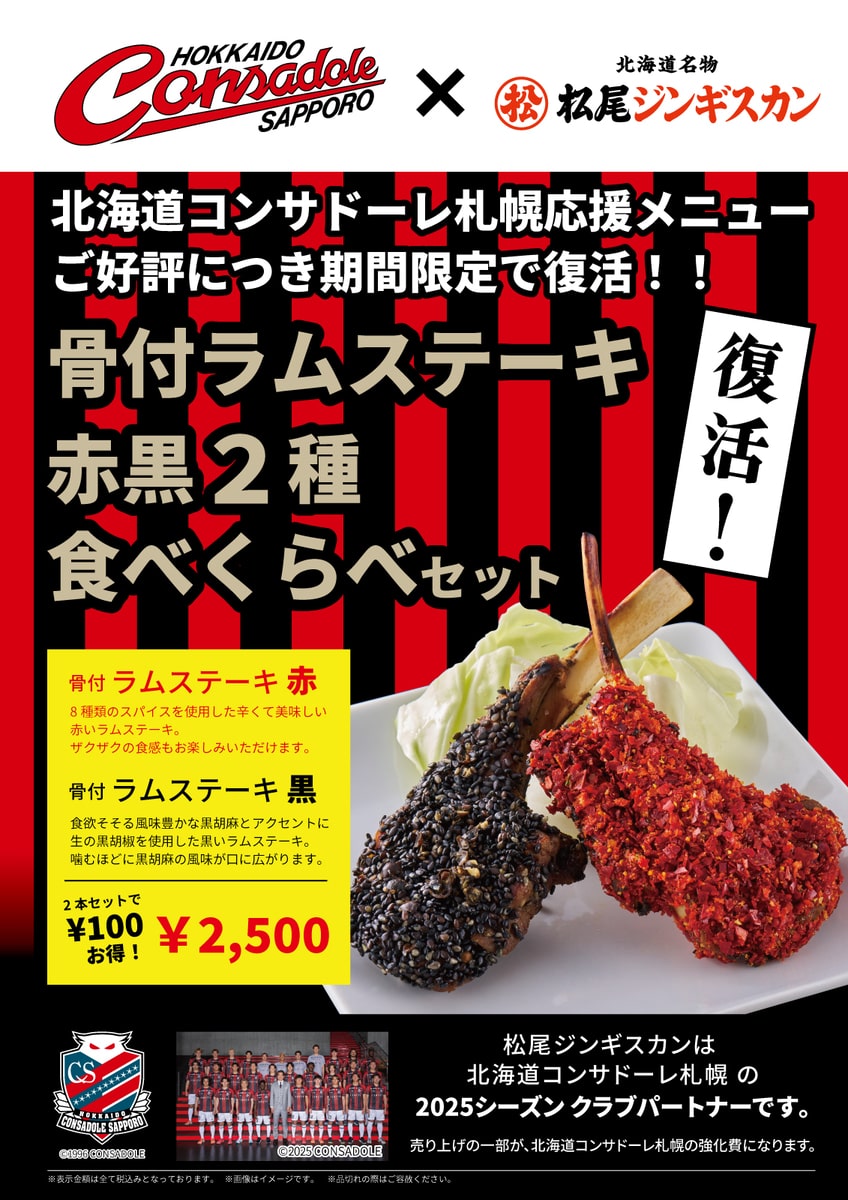 「松尾ジンギスカン」と応援メニュー「骨付ラムステーキ赤黒2種食べくらべセット」を食べて「北海道コンサドーレ札幌」を美味しく応援しましょう!皆さまのご来店お待ちしております。