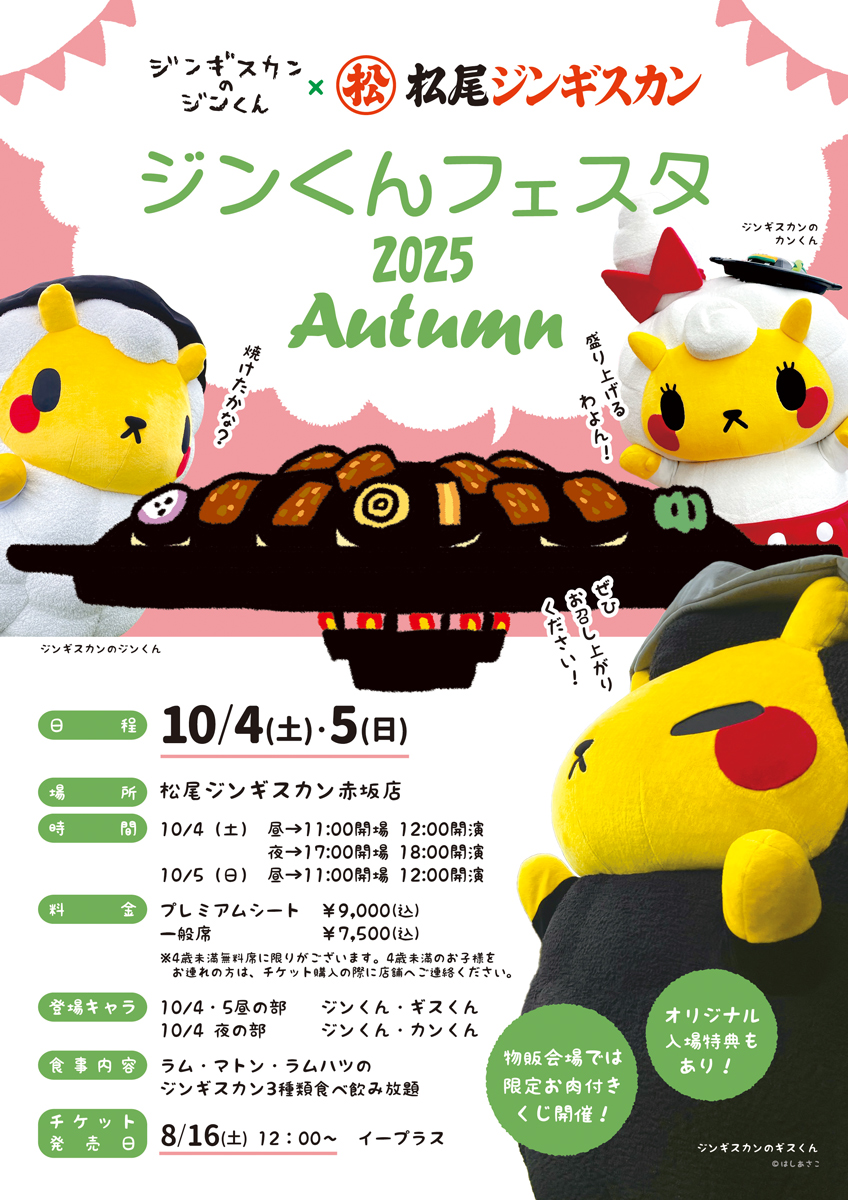 完全予約制、チケット販売は8月16日正午からとなりますので、ジンくんファンの方はもちろん、日頃より松尾ジンギスカンをご愛用頂いている方も是非ご参加ください。