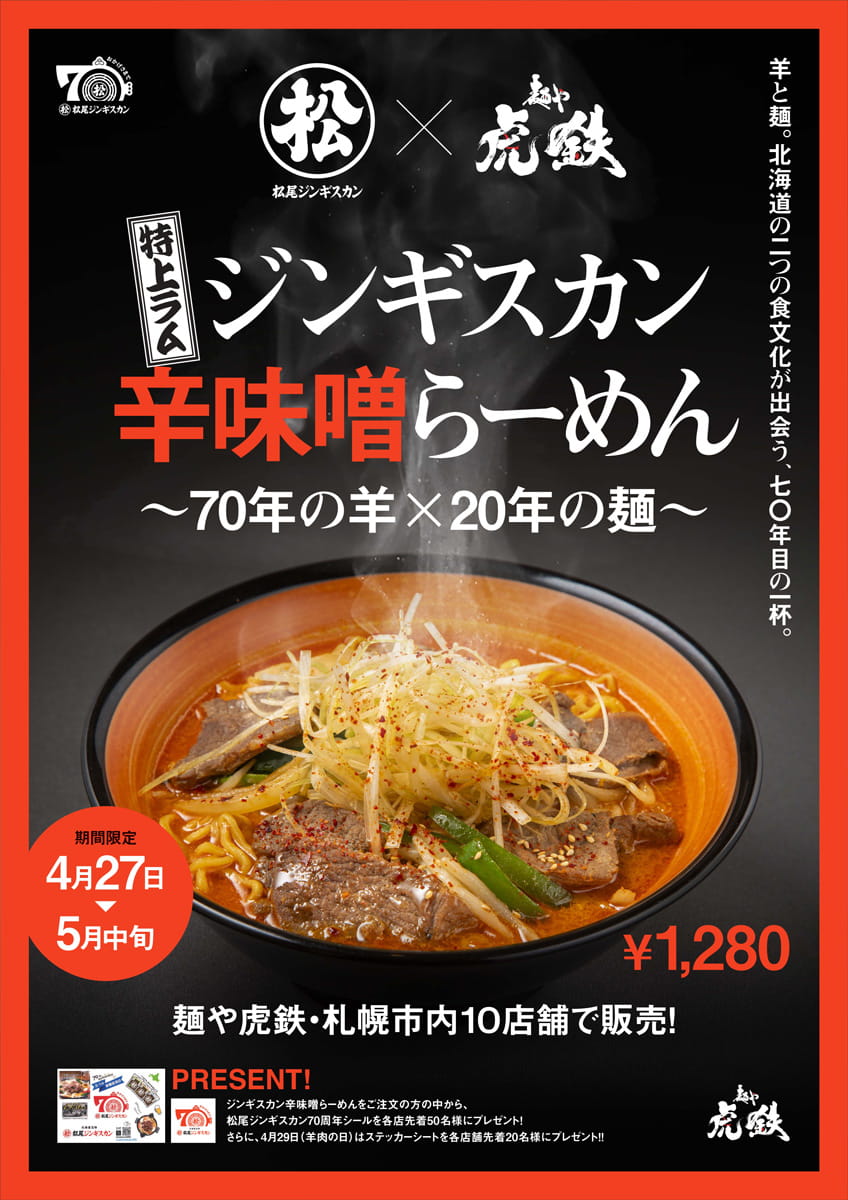 株式会社マツオ(本社:北海道滝川市、代表取締役:松尾吉洋)が展開する「松尾ジンギスカン」は、創業70周年を記念し、札幌を中心に展開する人気ラーメン店「麺や虎鉄」(運営:株式会社PLUS2、本社:北海道札幌市、代表取締役:土谷貴)とのコラボレーションメニュー「ジンギスカン辛味噌らーめん」を、2026年4月27日(月)より期間限定で販売開始することをお知らせいたします。